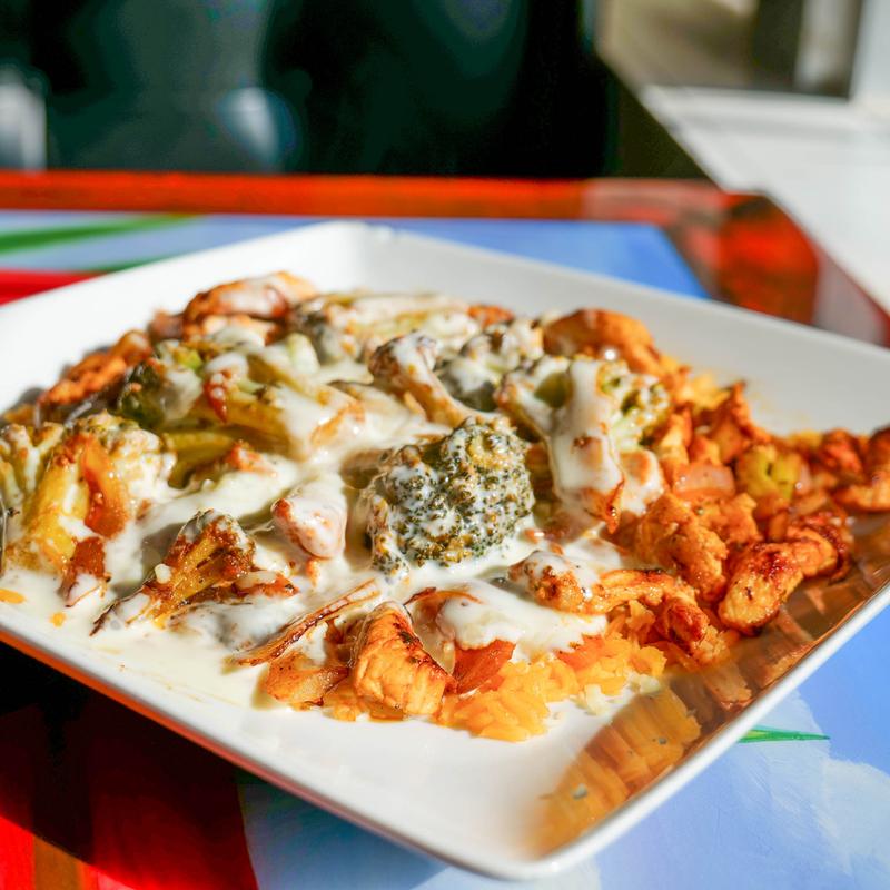 Chicken served on a bed of rice, topped with grilled broccoli, onions, and cheese.
