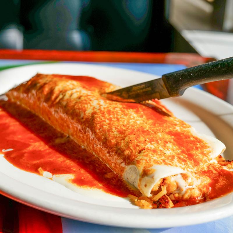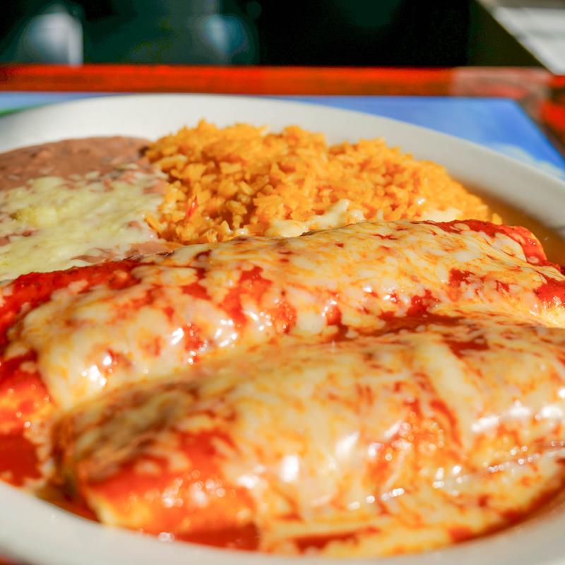One burrito, chicken, or steak, rice, beans, enchilada sauce, and cheese dip.