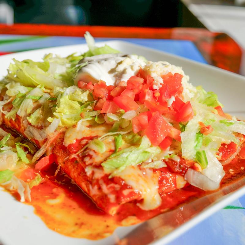 Two steak burritos topped with cheese sauce, lettuce and pico de gallo. Served with rice and beans.