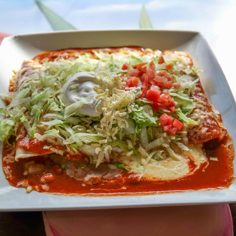 One cheese enchilada and one chicken enchilada, topped with lettuce, sour cream and Spanish rice.