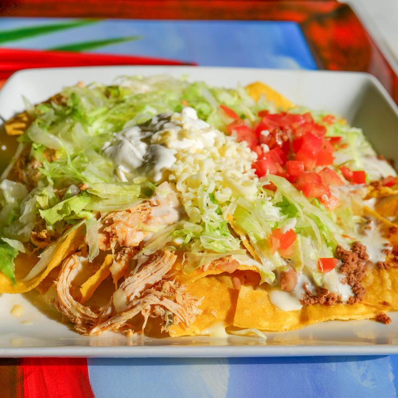 Tortillas chips covered with special sauce, chicken, and cheese. Served with lettuce, guacamole, and rice.